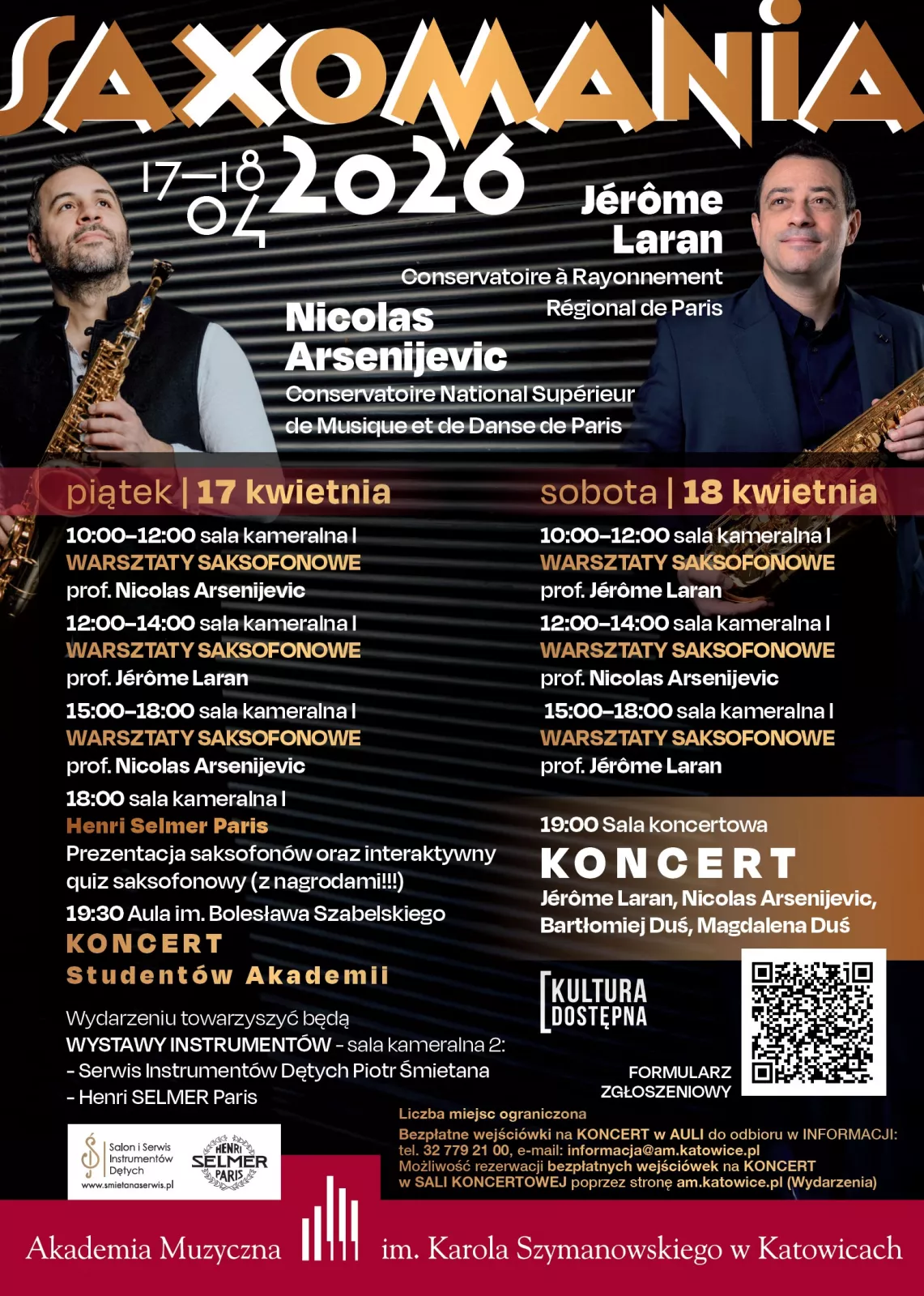 Bezpłatne wejściówki na koncerty: w Auli im. Bolesława Szabelskiego do odbioru w Informacji, tel. 32 77 92 100, e-mail: informacja@am.katowice.pl; w Sali koncertowej – rezerwacja poprzez stronę am.katowice.pl (Wydarzenia)