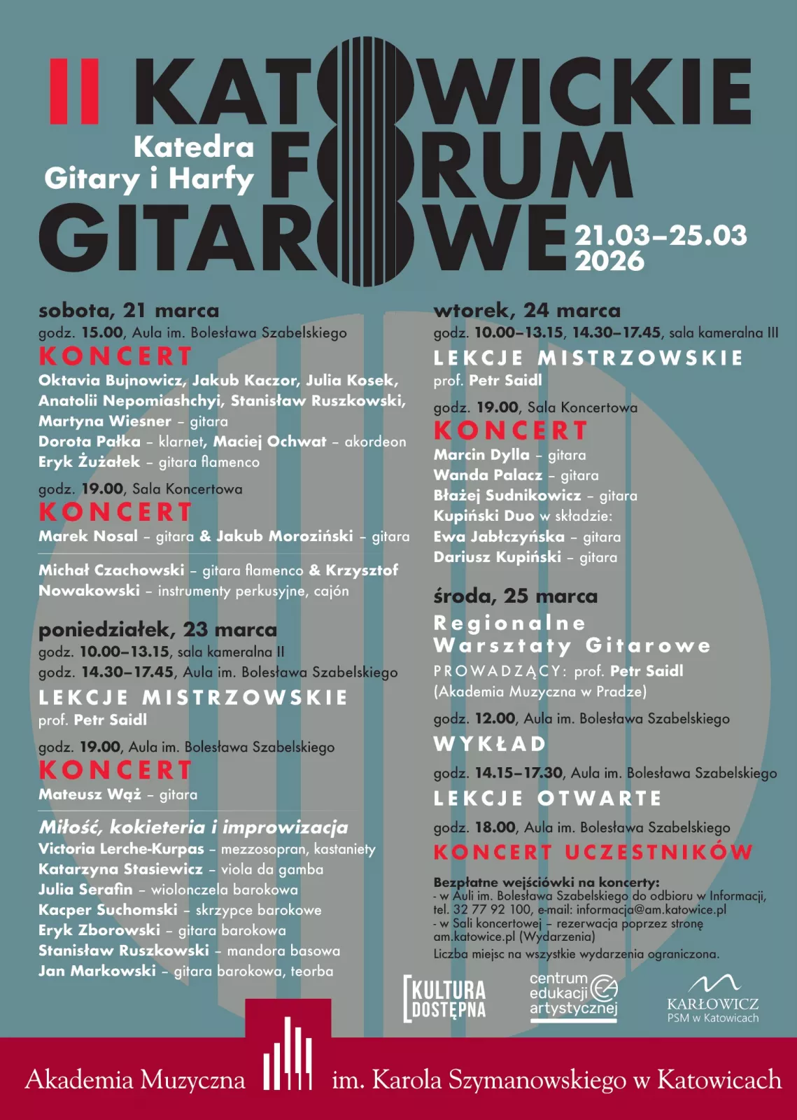 Bezpłatne wejściówki na koncerty w Auli im. Bolesława Szabelskiego do odbioru w Informacji, tel. 32 77 92 100, e-mail: informacja@am.katowice.pl. Możliwość rezerwacji bezpłatnych wejściówek na koncerty w Sali koncertowej poprzez stronę am.katowice.pl (Wydarzenia)