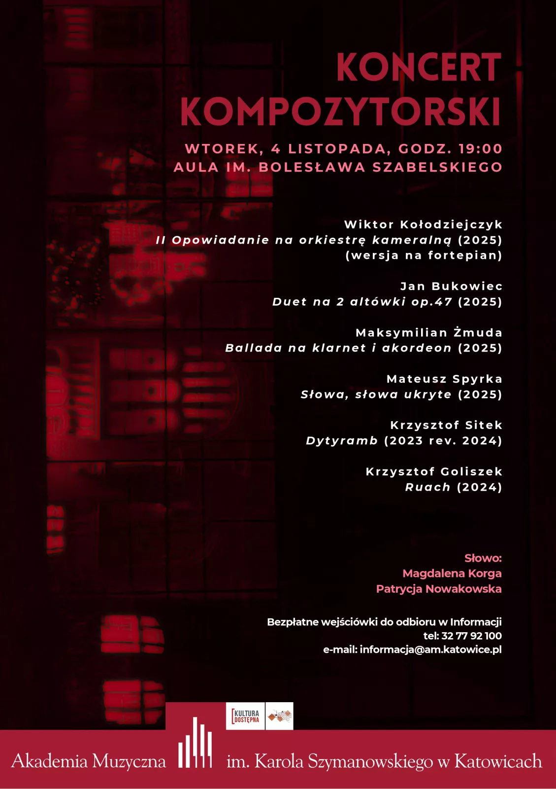 Bezpłatne wejściówki do odbioru w Informacji, tel. 32 77 92 100, e-mail: informacja@am.katowice.pl