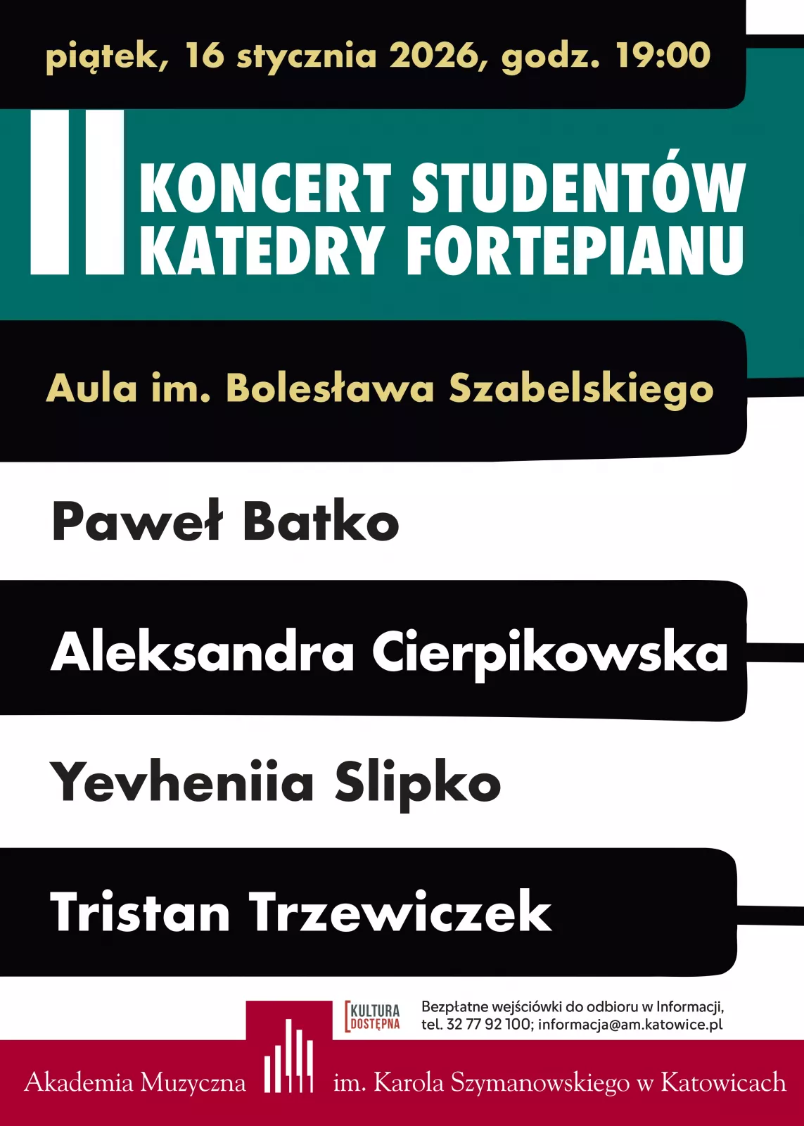 Bezpłatne wejściówki do odbioru w Informacji, tel. 32 77 92 100, e-mail: informacja@am.katowice.pl