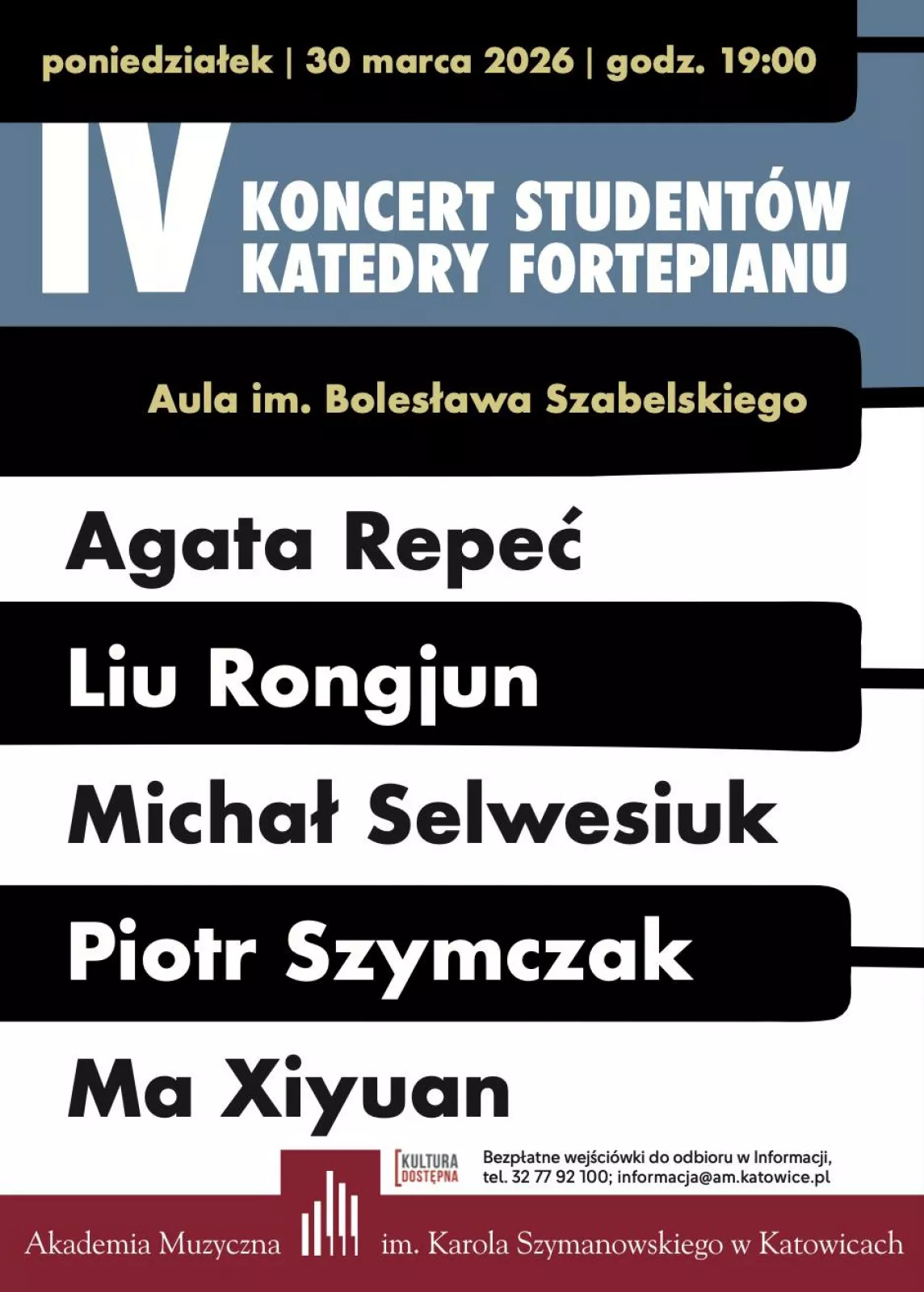 Bezpłatne wejściówki do odbioru w Informacji, tel. 32 77 92 100, e-mail: informacja@am.katowice.pl