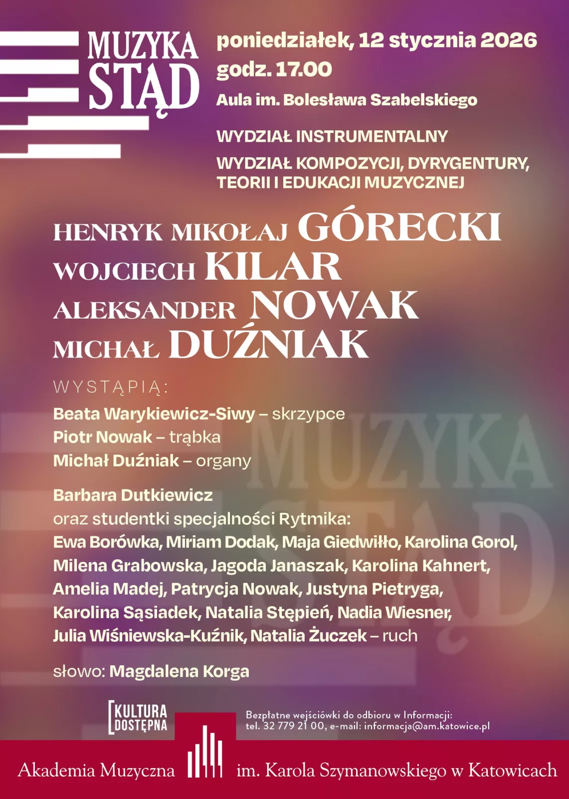 Bezpłatne wejściówki do odbioru w Informacji, tel. 32 77 92 100, e-mail: informacja@am.katowice.pl