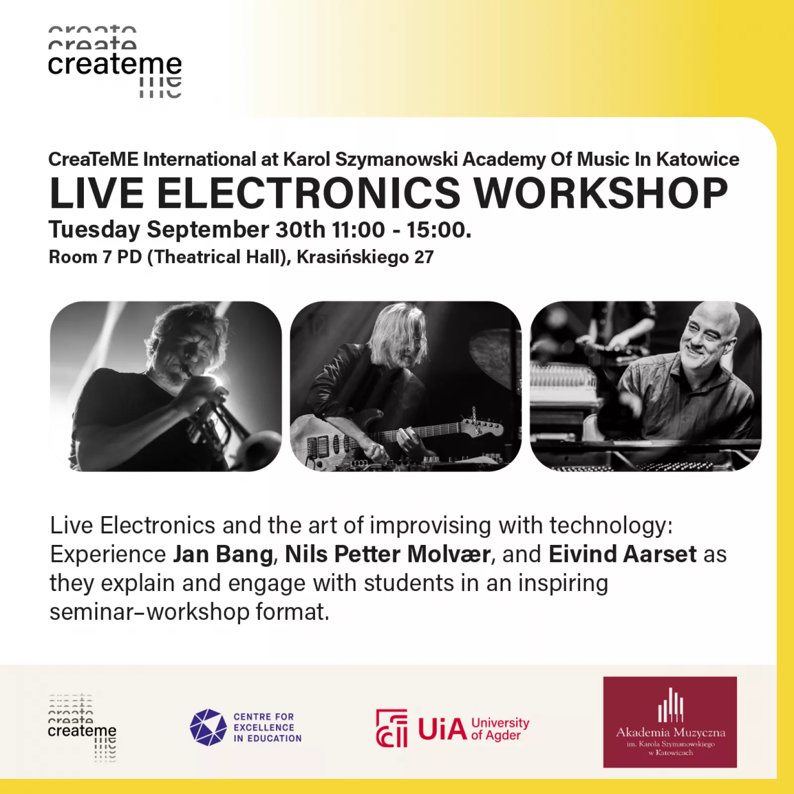 Live Electronics & Live Remix Workshop Nils Petter Molvaer - trąbka Jan Bang - gitara Eivind Aarset - live sampling, live remix