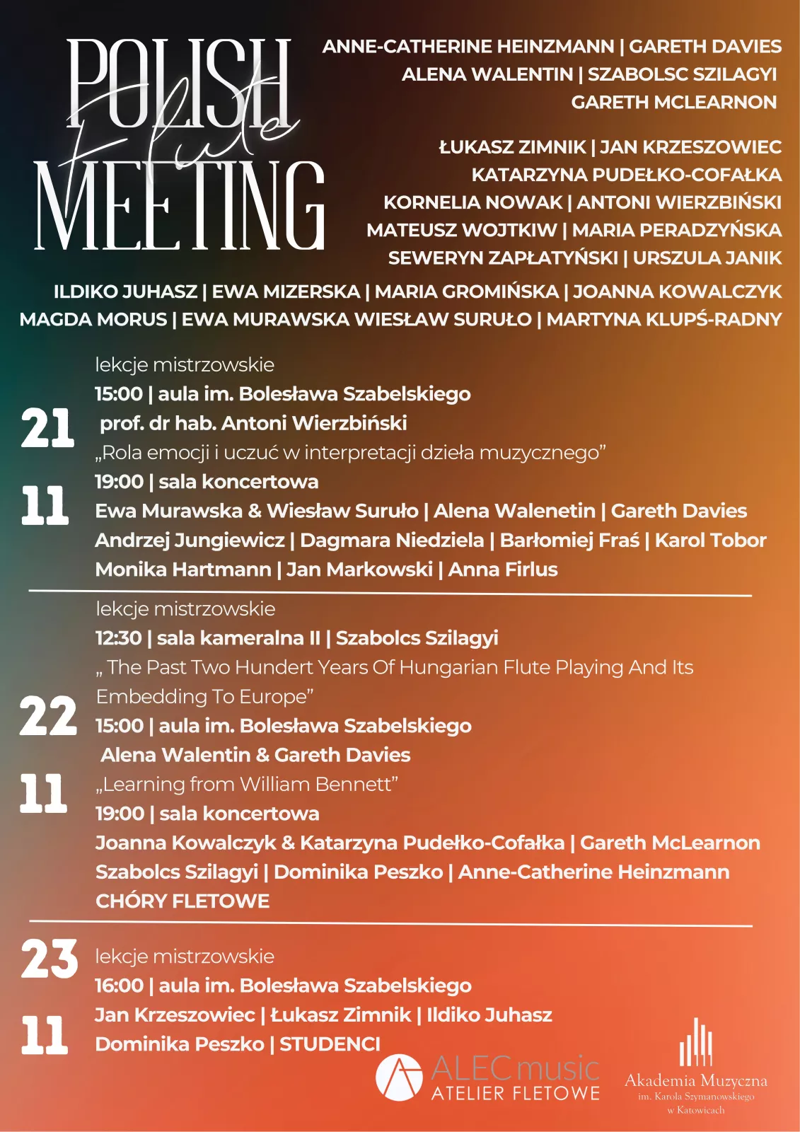 Zapraszamy na 11. już edycję Meetingu. W tym roku wśród wykładowców / artystów znajdą się: Gareth Davis, Gareth McLearnon, Anne-Carherine Heizmann, Alena Walentin, Ildiko Juhasz, Szabolcs Szilágyi, Antoni Wierzbiński, Urszula Janik, Ewa Murawska, Maria Peradzyńska, Wiesław Suruło, Ewa Mizerska, Martyna Klupś-Radny, Maria Gromińska, Magda Morus, Joanna Kowalczyk, Seweryn Zapłatyński, Mateusz Woijtkiw oraz pedagodzy klasy fletu naszej Akademii.